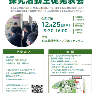 今回、国立研究開発法人科学技術振興機構(JST)がウェブサイト「サイエンスティーム」に、令和7年12月25日に埼玉県教育委員会主催で行った「探究活動生徒発表会」の様子が掲載されました。 当日の様子が分かる記事となっていま […]