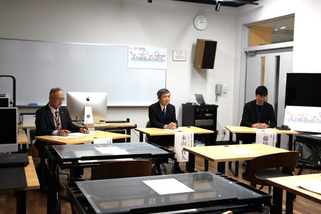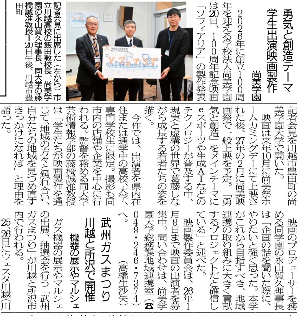 10月20日(月)に行われた制作発表会見には、学校法人尚美学園理事長・永山賀久プロデューサー、本学情報表現学科准教授・藤橋誠監督、本プロジェクトにご協力いただく川越市立川越高等学校校長・飯田敦様が登壇され、映画制作の概要やオーディション情報が公開されました。