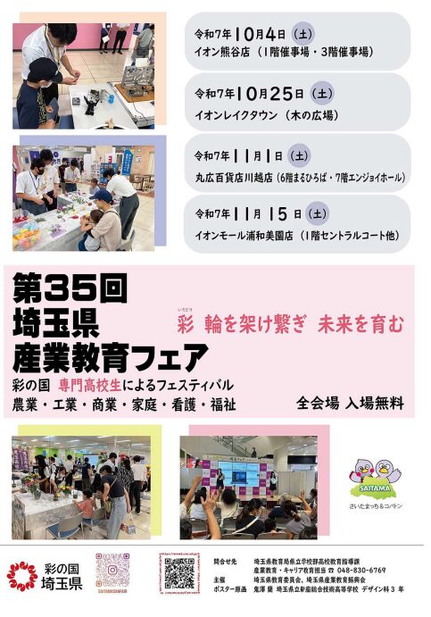 詳しくは、埼玉県のホームページ(埼玉県産業教育フェア – 埼玉県教育委員会)または、産業教育フェアのホームページを御覧ください。