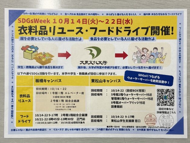 大東文化学園で2022年度より本格的にSDGs推進の取組みをしています。その一環として、昨年度に引き続き2025年度も本学園の学生・生徒・教職員を対象に、「衣料品リユース」及び「フードドライブ」を実施しました。