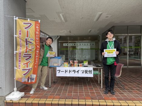 ①10月21日は正門前にブースを作り食品の回収を行いました ②10月22日は雨のため2号館にて回収を行いました