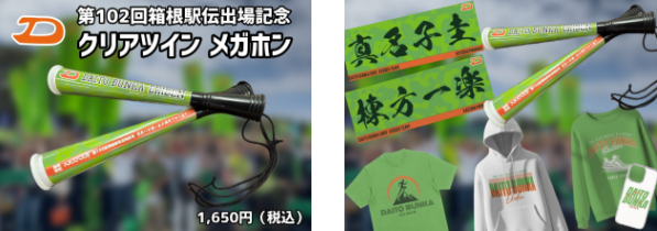 今大会から「箱根駅伝」名称や「箱根駅伝角印ロゴ」を使用したオリジナル出場記念グッズの企画・販売を関東陸上競技連盟が認めることとなりました。今回は「ツインメガホン」を陸上競技部男子長距離オフィシャルオンラインショップにて、2026年3月31日まで数量限定販売しています(下記URLサイト)