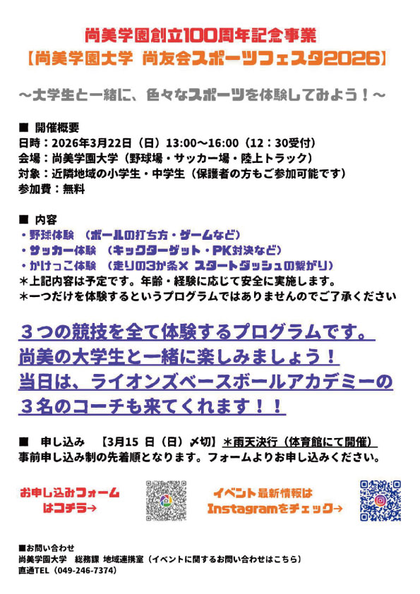 【尚美学園大学】尚美学園大学尚友会スポーツフェスタ2026を実施いたします!