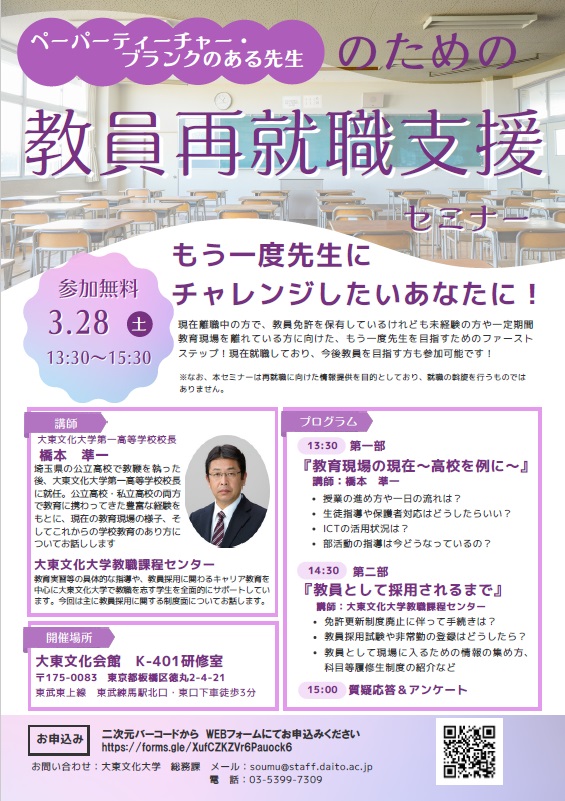 【大東文化大学】ペーパーティーチャー・ブランクのある先生のための「教員再就職支援セミナー」の開講について