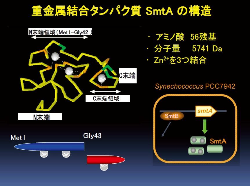 近年の人類の生産活動に伴う環境水中の重金属イオン濃度変動による環境破壊を、生体中の重金属結合タンパク質が結合する重金属イオンの量をタンパク質科学的に増加させた水棲生物を用いて未然に防ぐことで、故郷の自然環境の保護を目指します。