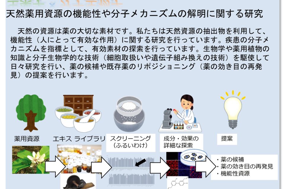 薬用資源の機能性に関して、分子生物学的な観点で研究をしています。異分野融合型の研究や産学連携など自由な発想のもと、楽しく研究をしています。例えば、DNA検査を誰でもできるように、マイクロ流体技術とDNA検査技術を組み合わせて、研究開発をしています。産学連携では、化粧品会社さんと連携しながら、薬用資源の持つ魅力を文理を超えた観点から見出す取り組みをしています。